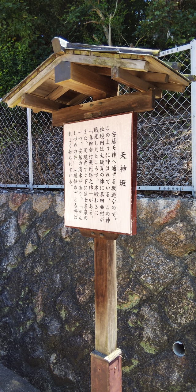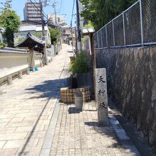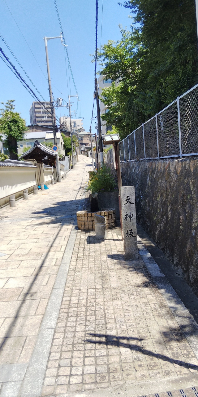 菅原道真公をまつる安居天神に続く坂なので、天神坂の名がついたそうです。雰囲気の良い感じの石畳の坂が続いています。天王寺七坂のひとつで、逢坂に続く南から二番目にある坂です。最寄り駅は大阪メトロの四天王寺前夕陽ヶ丘駅です。