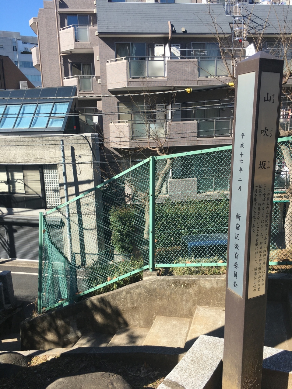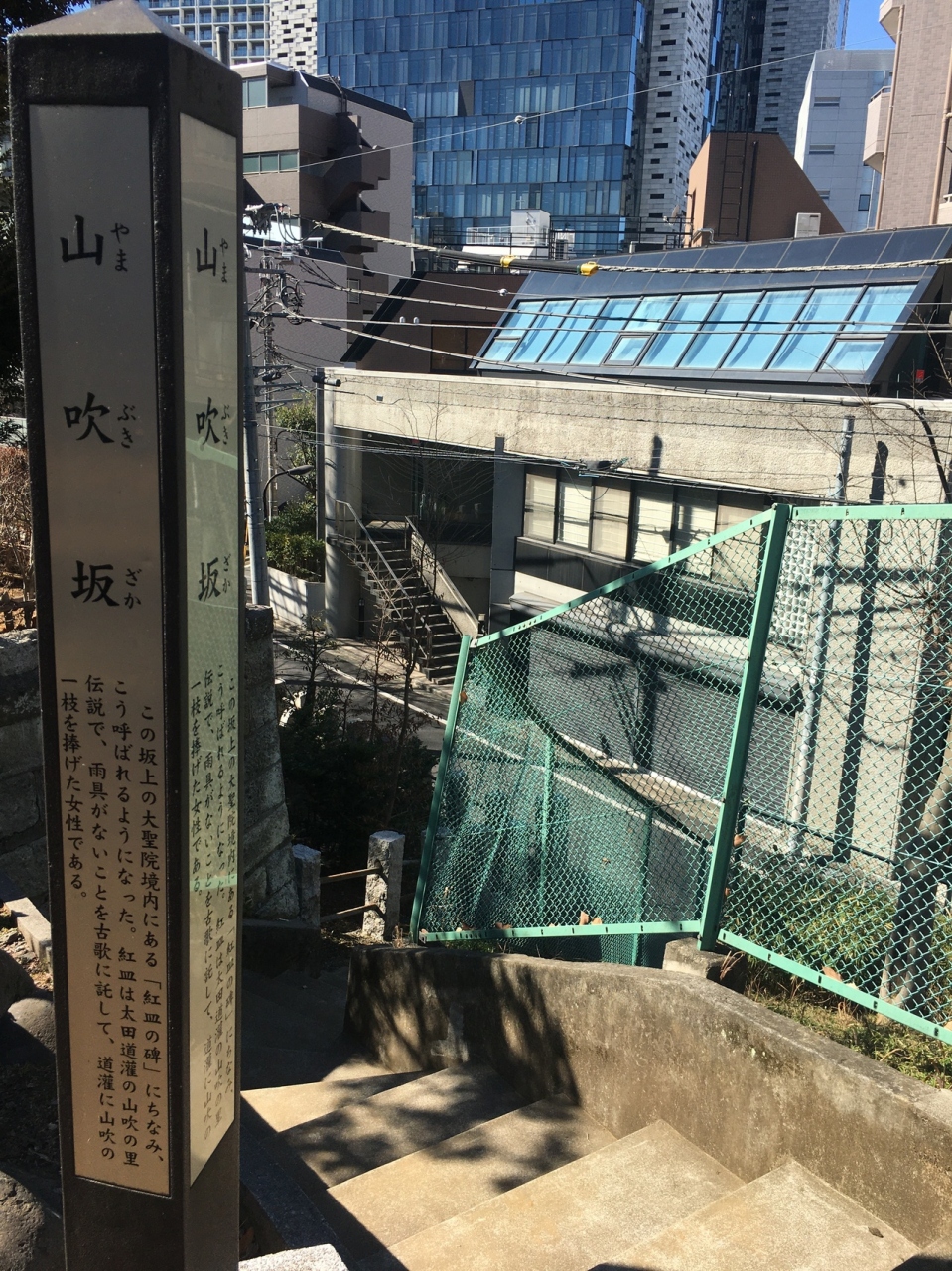 大聖院と西向天神社の境内から急な階段になっていて、階段を降りると坂道になっていました。坂道の由来が書いてある細い碑には太田道灌のことが記載されていました。階段は直線ではなく一度曲がり、幅が狭く短いです。