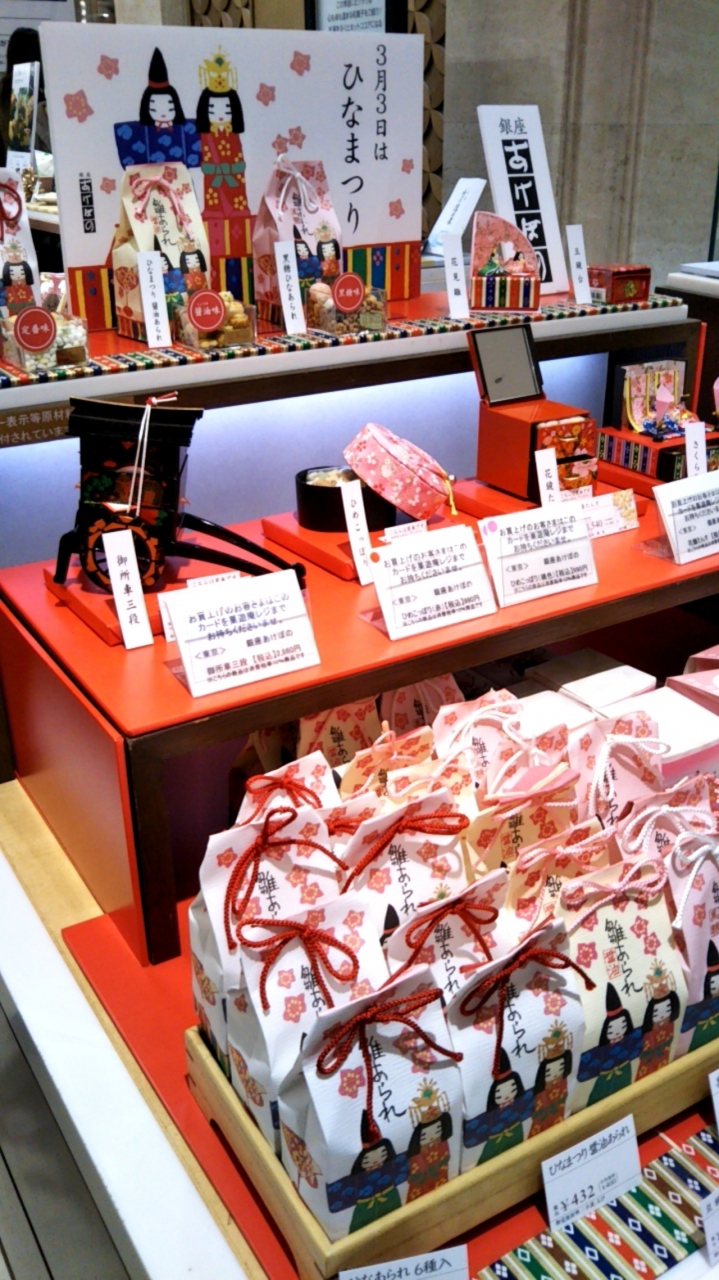 「日本橋三越本店」にある『菓遊庵 日本橋三越本店』の売り場は、もう春を迎えています。売場には「ひなまつり」の祝菓子が並び始めていました。ちょっとこころに明るさが灯るお菓子ばかりです。