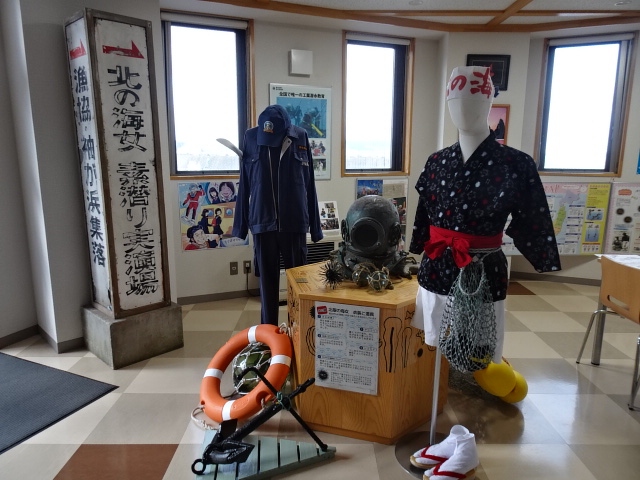 小袖海女センターでは観光案内所や産直施設、海女を紹介する展示コーナーがあり、ドラマの脚本も展示しています。屋上からは海景色がきれいです。