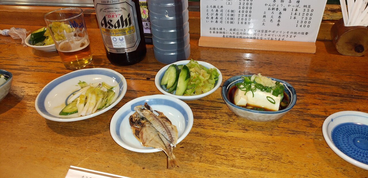 大将とお父様にお相手頂きながらたっぷりの湯豆腐にお漬物更に烏賊と野菜和えにあじの干物焼きのお通しでビール後