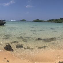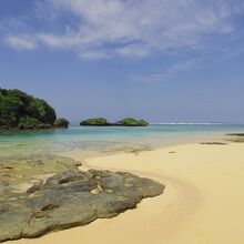 砂浜と岩場が混在する星砂の浜。岩場があることで透明度が高くまた遠浅であることから水温も比較的高い感じ。少し沖にいったところには大きな岩がいくつかあり、大きな波を打ち消してくれる。波が穏やかであれば、岩場で膝下ぐらいまで海に入りあたりを見渡すと、近くを大きな魚が通り過ぎてゆくのを目撃できる。