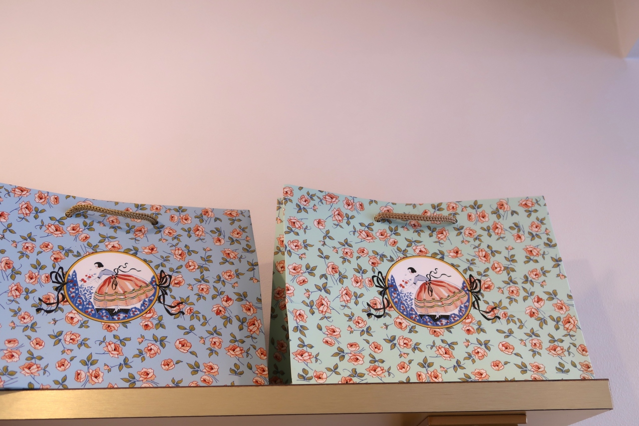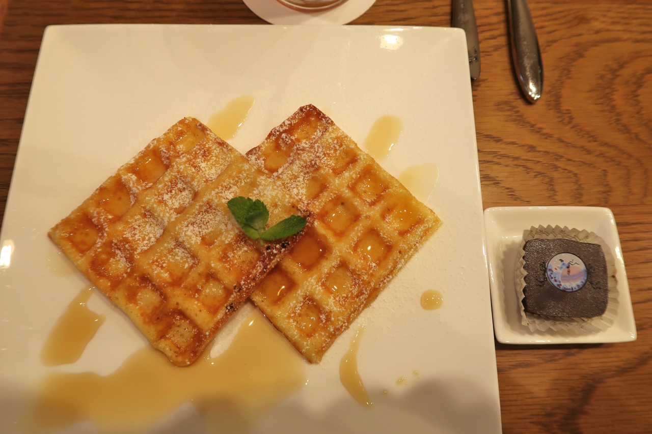 1919年創業、ブリュッセルのロワイヤル通りに本店があるMary Chocolatierの京都支店です。日本支店の店名は、創業者マリー・ドリュックにちなんでいるようです。京都のお店らしく小屋根の上に鍾馗さんが据えられた町家を改装したお店で、店内には木の階段があちらこちらに残されていました。そんな階段を上がって2階のカフェで、ブリュッセルワッフルプレーンとショコラ1個、アイスティーのセットをいただきました。ショコラは1個400円で、マリーさんが1940年代にデザインしたドレス姿の女性のイラスト入りのハイカカオ・ダークチョコレートMy Ladyを選びました。1階のお店の商品パッケージは、猫舌チョコレートは猫のイラスト、板チョコレートは犬のイラストが描かれるなど、かわいいものばかりでした。