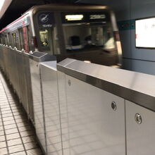 車両はオールロングシート。なんば駅で御堂筋線と比較的短距離の移動で乗り継ぎできます。