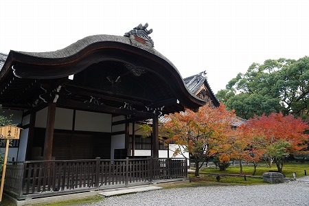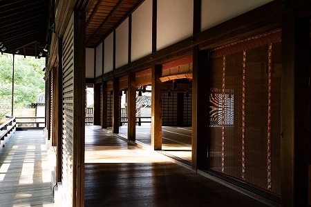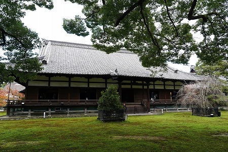 境内に入り、靴を脱いで建物内へ。華頂殿から庭園を眺めます。続いて御所の建物だった宸殿、小御所、本堂を順次見学。次々現れる庭園と座敷の様子を眺めます。緑が濃いところ、紅葉に彩られたところ、池を配し錦鯉を堪能できる庭園と、次々現れる庭園を鑑賞することができます。最後に庭に降ります。相阿弥の庭を歩き、龍心池をめぐって、庭を回って鐘楼を経て出口へ。回遊式観光コースになってます。