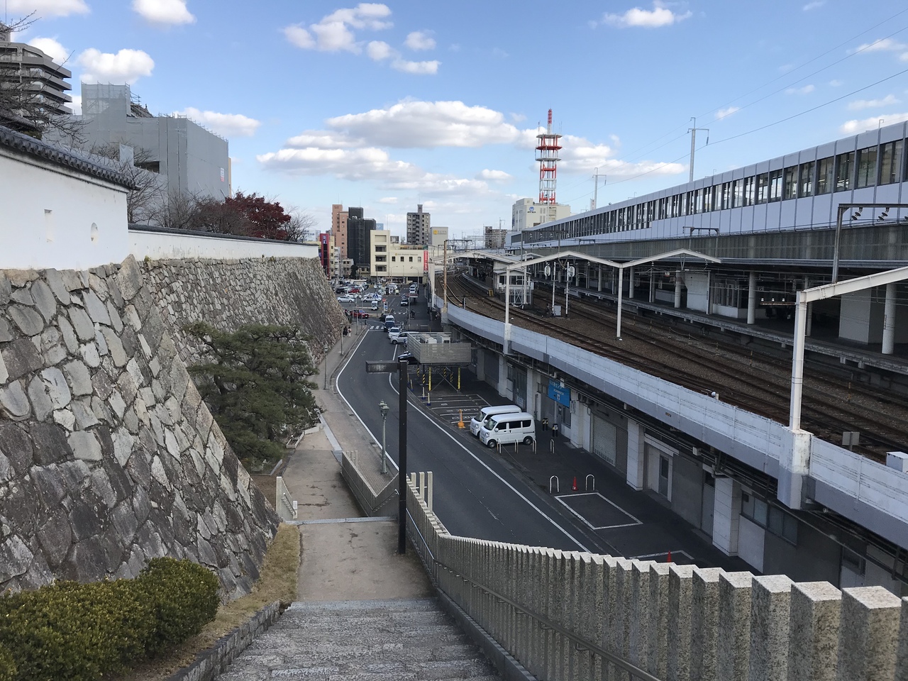 福山城跡は福山駅前にあり、ホームからは国の重要文化財の伏見櫓・筋鉄御門が眼前に眺められる。