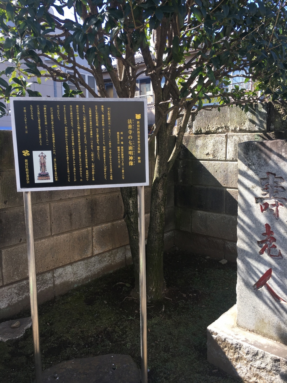 日蓮宗の守護神七面明神像がありましたが見ることは出来ませんでしたが写真を見ると表情は穏やかな表情でした。本殿の屋根は急勾配で、左右には水を溜める桶のようなものがありました。境内は木や石碑が最前都並んでいました。