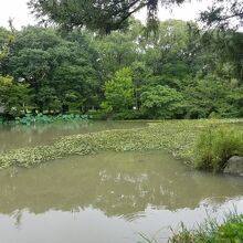 絵馬堂の裏手に広い池がありました。水面の古代ハスや目の前の小島に建つ能舞台は簡単に見られますがさらに奥側の小島には水分神社があったり対岸の畔には御霊水があったりと見所が多いので池を一周するぐらいの覚悟でじっくり見て回るのも良いと思います。