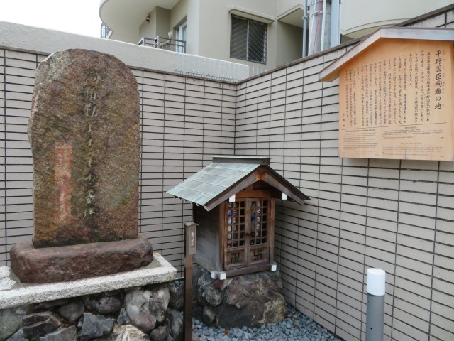 マンションの前に石碑と祠があります。説明板を見ると、「平野国臣殉難の地」とありました。しかし、よく見ると、「この地はもと六角獄舎があったところ」と書いてありました。尊王攘夷に参加した者が収容された場所で、歴史の転換点になった場所ですね。