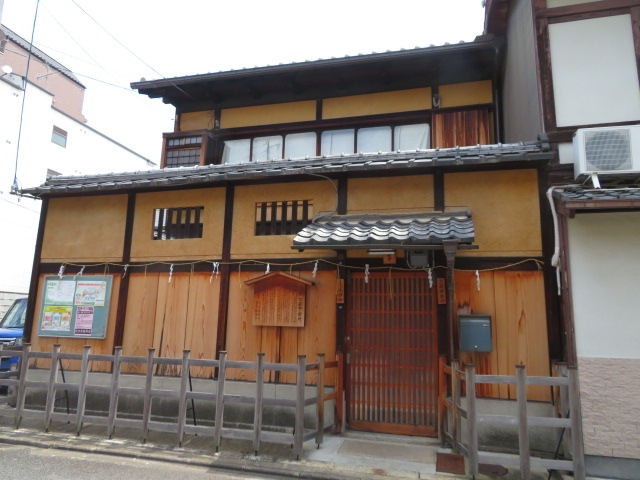 この付近は二条城築城の頃より二条御通りと呼ばれていましたが、元禄から享保にかけて三条台村に地名が変更になりました。格子戸の上にまで屋根の付いた少し洒落た町家という雰囲気です。正面が黄土色で側壁がこげ茶色のツートンカラーですよ。