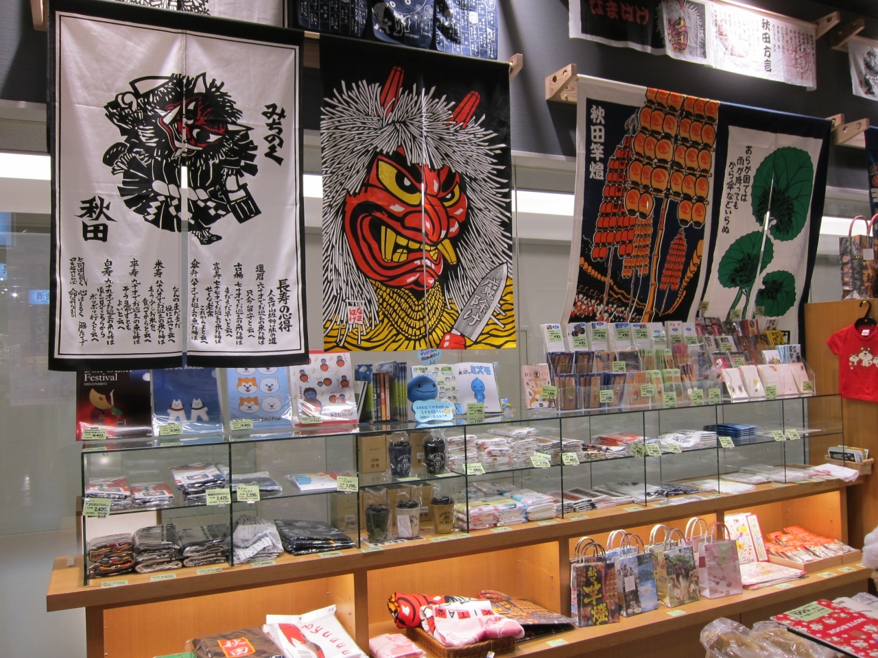 面白いのは民俗芸能であるなまはげのお面や暖簾にTシャツなどは一昔前の観光土産としては喜ばれた懐かしい物?。
