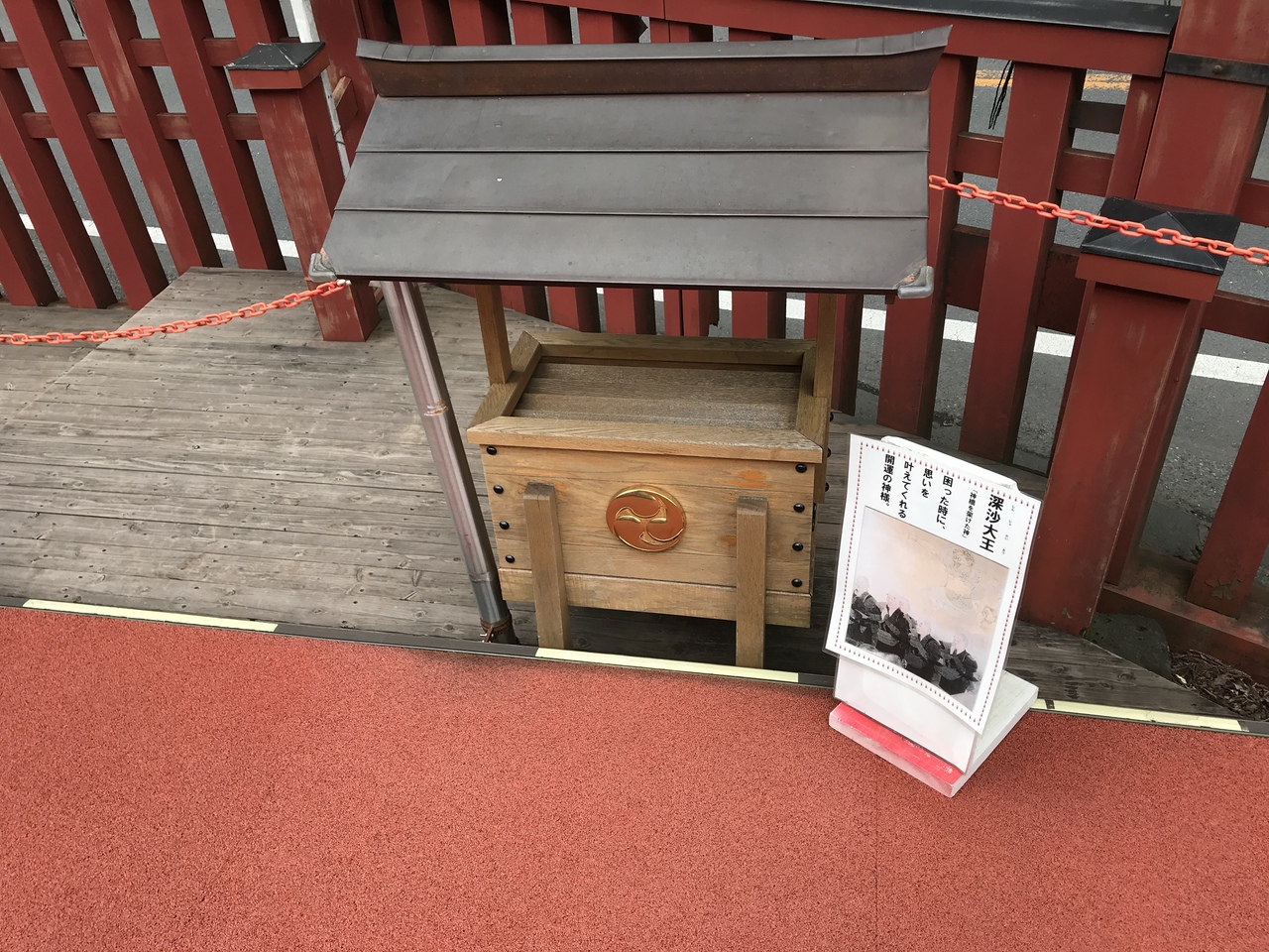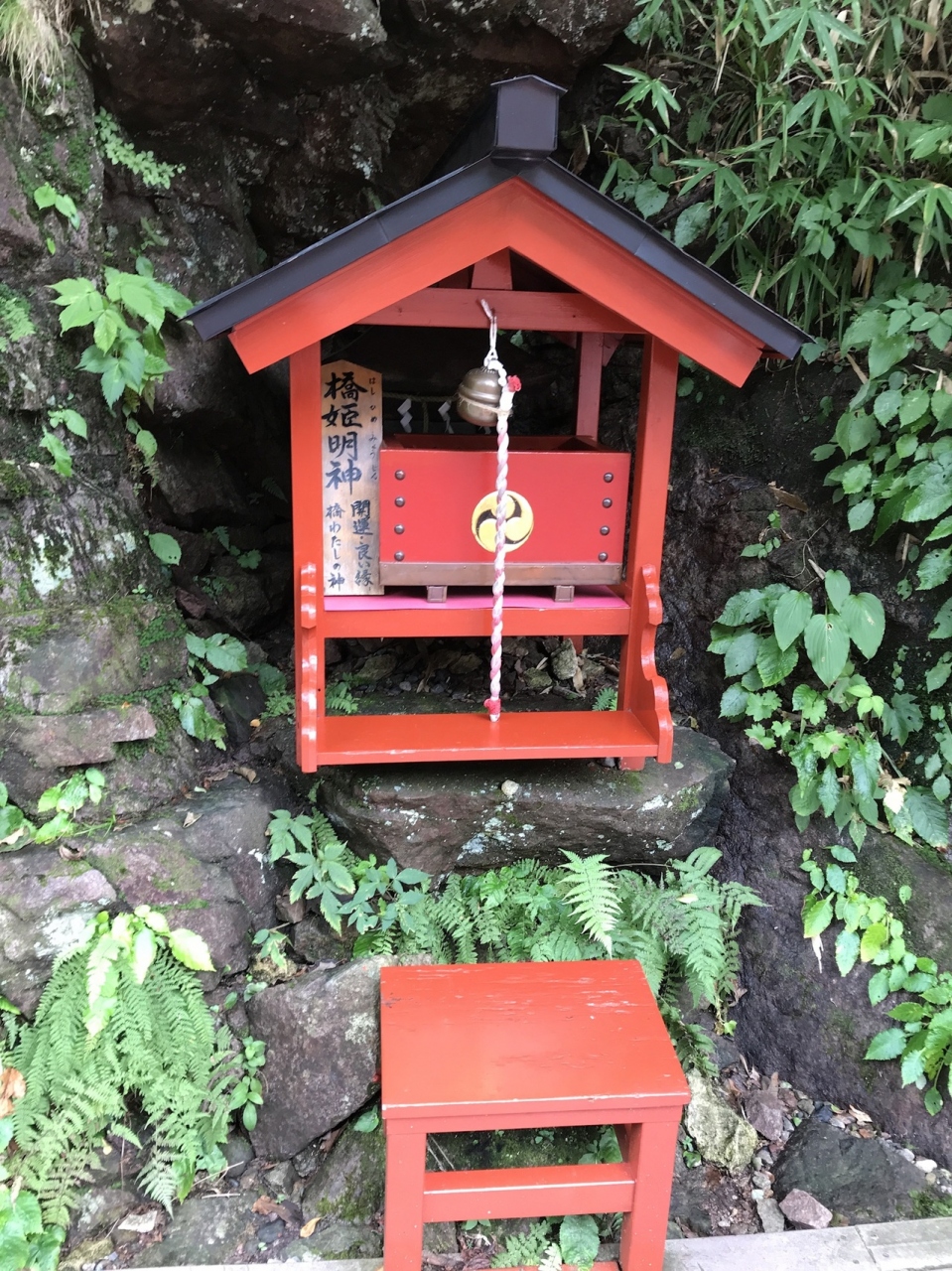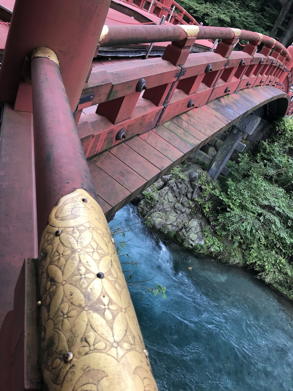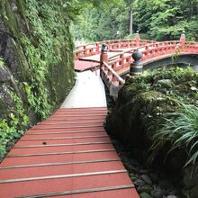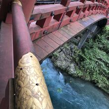 橋の手前にお守りなどを買うところがあり、拝観料はかかりますが、橋を渡ったところにある小さな祠にお参りすることができます。赤い木の橋が、周りの緑に映えます。水の色も場所によって変わり、とてもきれいなエメラルドグリーンのところもありました。