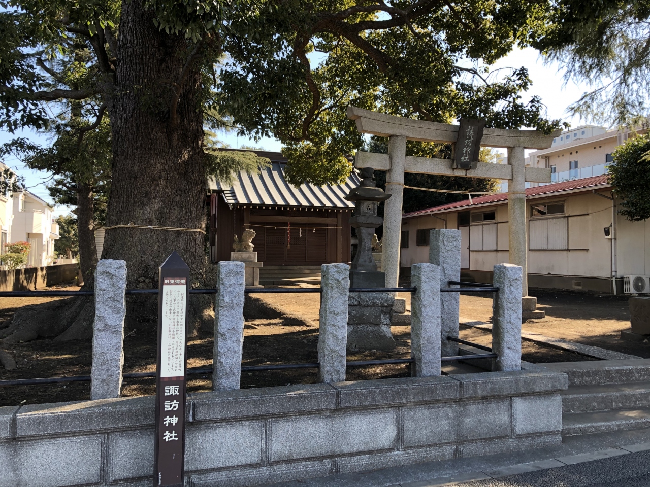国道1号線にある「諏訪神社前」バス停(下り線バス停)から、200mほどの所に諏訪神社があります。創建年は不明ですが、明治40年に、この場所に移転してきました。ここの周囲が「鉄砲宿」という地名であったことから、武神の諏訪神社を勧請したのが由来と伝えられています。