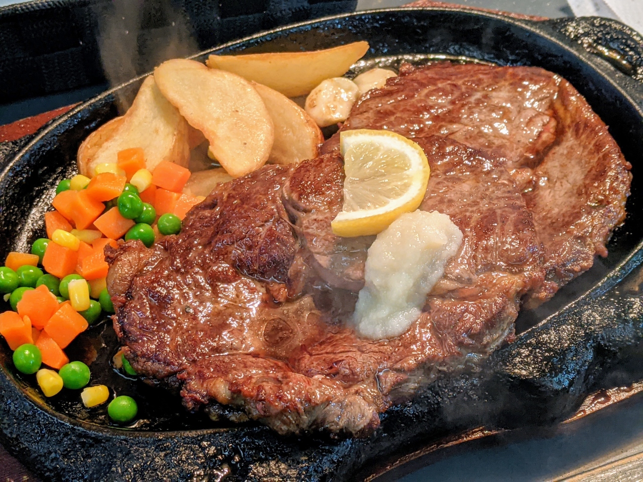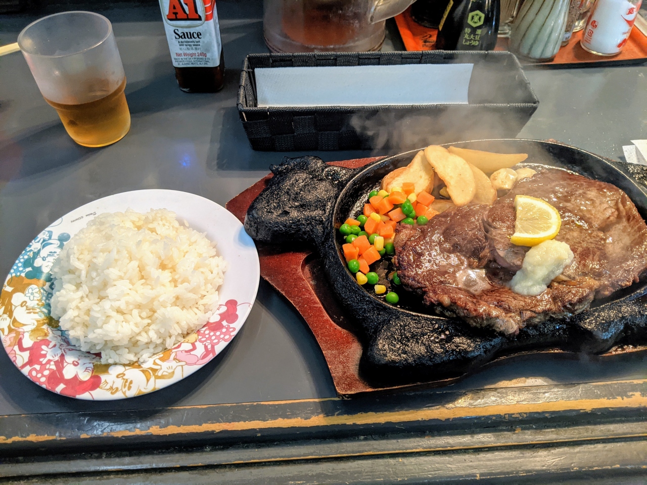 沖縄では○○食堂が多数有りますね。行ったことがあるのは・・・空港食堂、花笠食堂と「ハイウェイ食堂」ですかね。「ハイウェイ食堂」は、ゆいレール美栄橋駅から徒歩5分程度。国際通りのJALシティからですと徒歩10分程度ですかね。24時間営業ですので、夜中に行って「名護そば」「みそ汁定食」も良いのですが・・ 私のオススメはステーキ! リブロース400gで2300円。サーロインも選べますが、脂の少ないリブロースがオススメですね。沖縄でステーキと言えば、「あの」スープもついてきます。しっかりコショウをふれば美味しいですね。