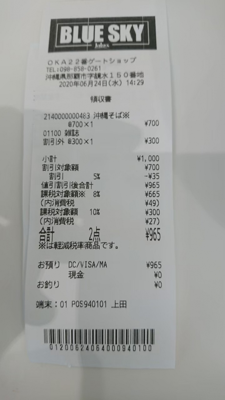 沖縄そばは割引になりましたが、雑誌は割引になりませんでした。すべての商品が割引になるわけではないので注意してください。