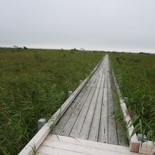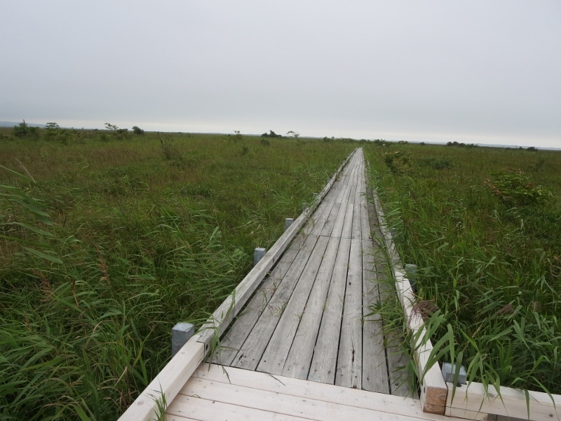 サロベツ原野は泥炭土でできていることもありますが、自然保護の面からも木道の上を歩くようになっているようです。北海道は広いので、見渡す限り平坦に見える原野を見ながら歩くのは気分が良かったです。曇りで空が青くなくて残念でした。