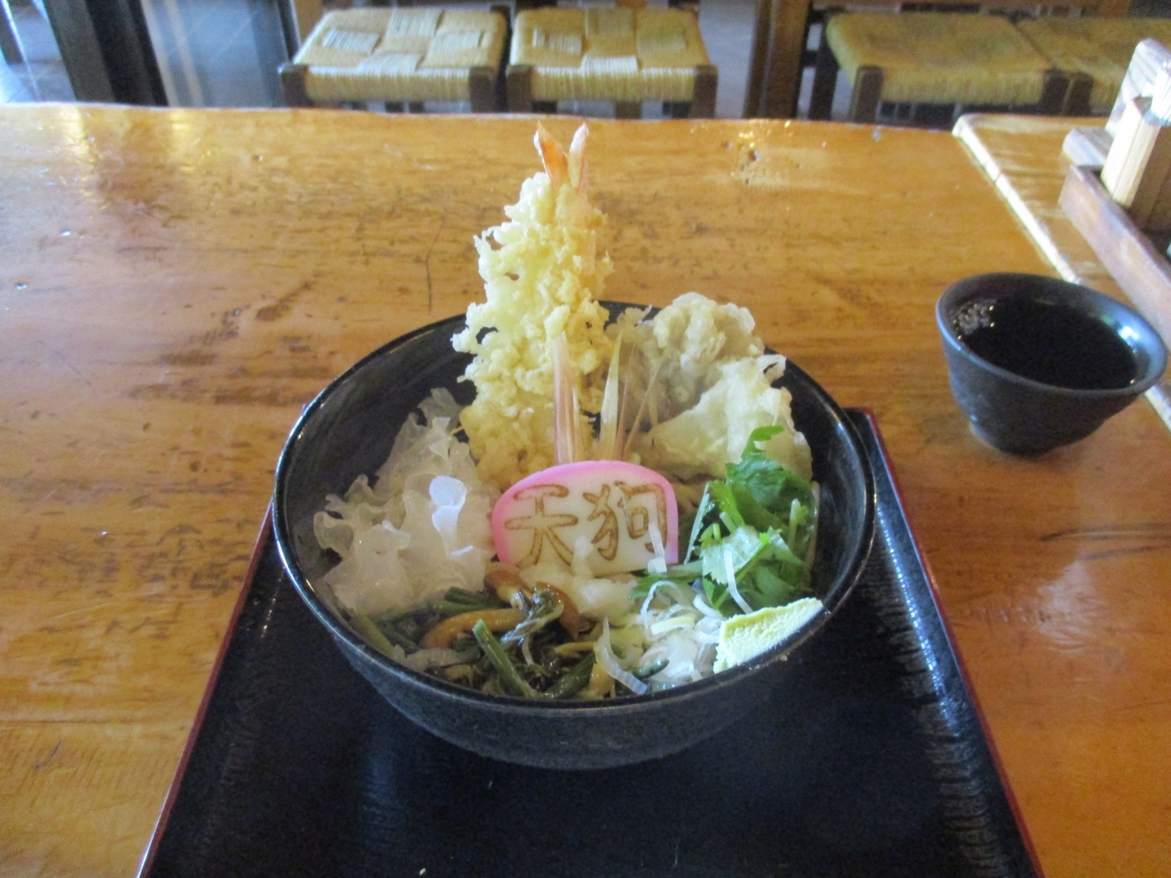 天麩羅の海老(若干小振り)をバックに天狗の焼き印入りの蒲鉾が印象的な盛り付けで、他にはマイタケの天ぷら、白木耳、山菜、三つ葉、ミョウガなどが冷たいお蕎麦の上にトッピングされており、お蕎麦自体は茶色で平たい太蕎麦で食感は少しモコモコ、蕎麦汁は甘めでした。