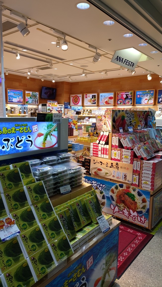 空港の土産物店は定番がコンパクトにまとまり荷物の異動が楽なこと、特にANAカードの会員なら1000円以上の買い物なら10%割引、さらにマイレージポイントも加算されます。海ブドウなど珍しい土産もありました