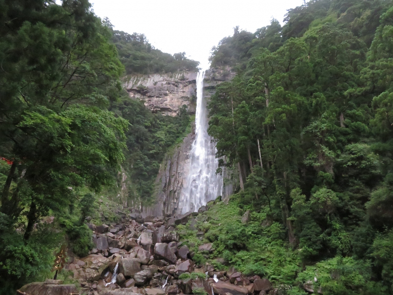 断崖の上から豪快に流れ落ちる高さ133mの滝は、飛瀧神社の鳥居の先から見ると迫力満点です。行った日は台風が接近していた日でもあり、滝の水がどんどん風で流されてもいました。