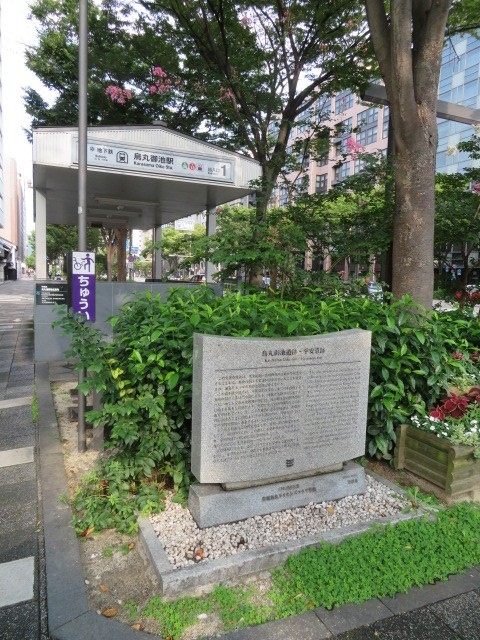 烏丸御池駅の出口を出てすぐにあります。この交差点付近は、縄文晩期~古墳時代の土器が多数出土することから、有史以前より集落が営まれていたことが推定され、地名をとって烏丸御池遺跡と呼ばれています。人通りは多いですが、この歴史ある石碑の前で立ち止まる人はほとんどいませんでした。