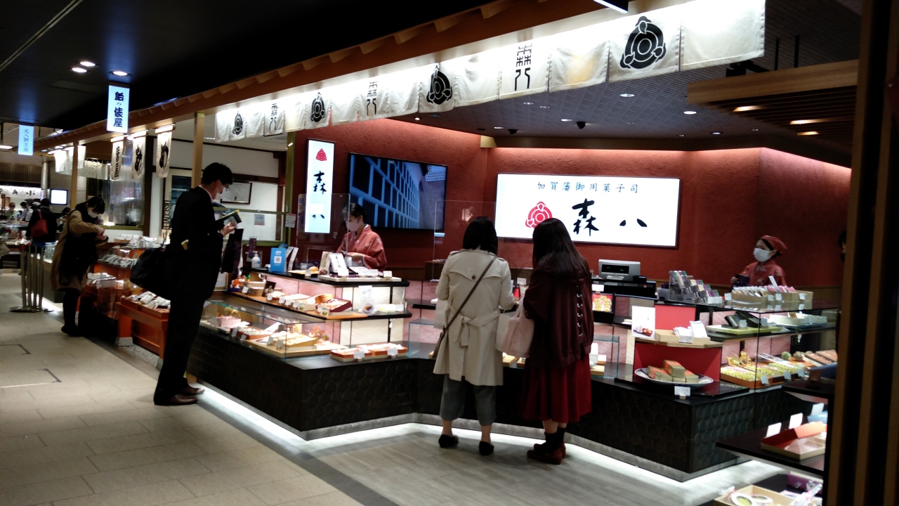 金沢に滞在中こちらの場所を訪れました。金沢駅のあんとに入る森八さんのお店へお土産を買いに行きました。観光してから行ったので夜になってしまい、お目当ての長生殿が売り切れてしまっていたので次の日早めに行って手に入れました。