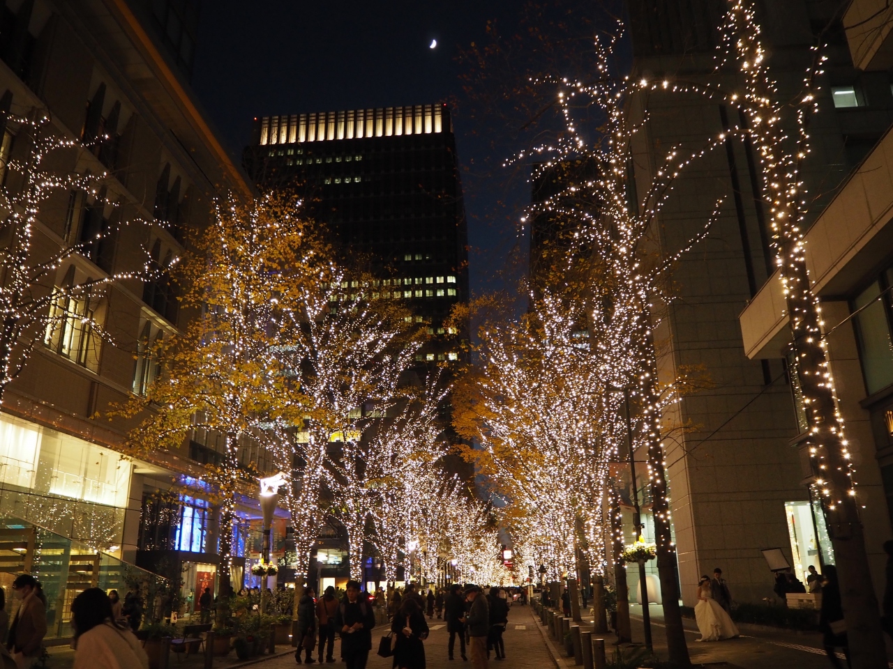 新型コロナの影響であちこちでイベントなどが中止になっていましたが、丸の内のイルミネーションは医療従事者などへの感謝の気持ちということで点灯されていました。例年通りのシャンパンゴールドの灯りでとてもきれいでした。