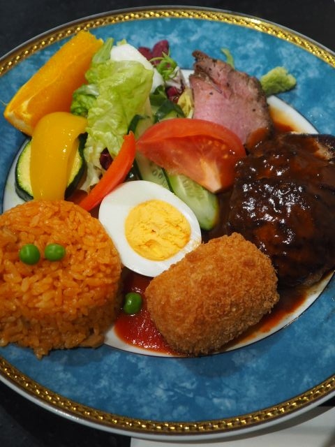 蟹クリームコロッケ、ハンバーグ、ローストビーフ、チキンライス、サラダ、フルーツ、スープ、サラダ、チキンライスから成る。