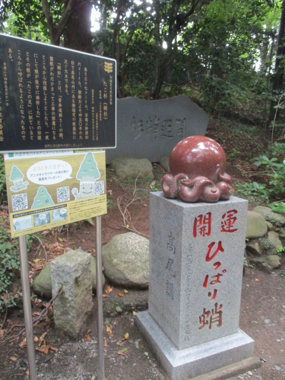 蛸杉の周りには人が触れないように柵が設けられており、そばには「開運ひっぱり蛸」という蛸の石碑がつくられ、頭をなでると運を引き寄せるという開運ひっぱりだこは人気のパワースポットのひとつです。