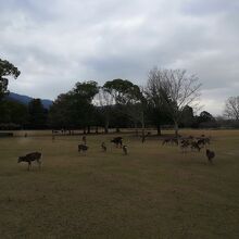 浮見堂を見学したあと、道路を渡って東側にいくと拓けた芝生のエリアがあります。鹿寄せなどが行われるエリアで、通常の時期でも鹿がたくさんいました。春日大社に行く際は参道より、こちらから行った方が見学スポットがあると思います。