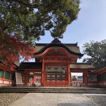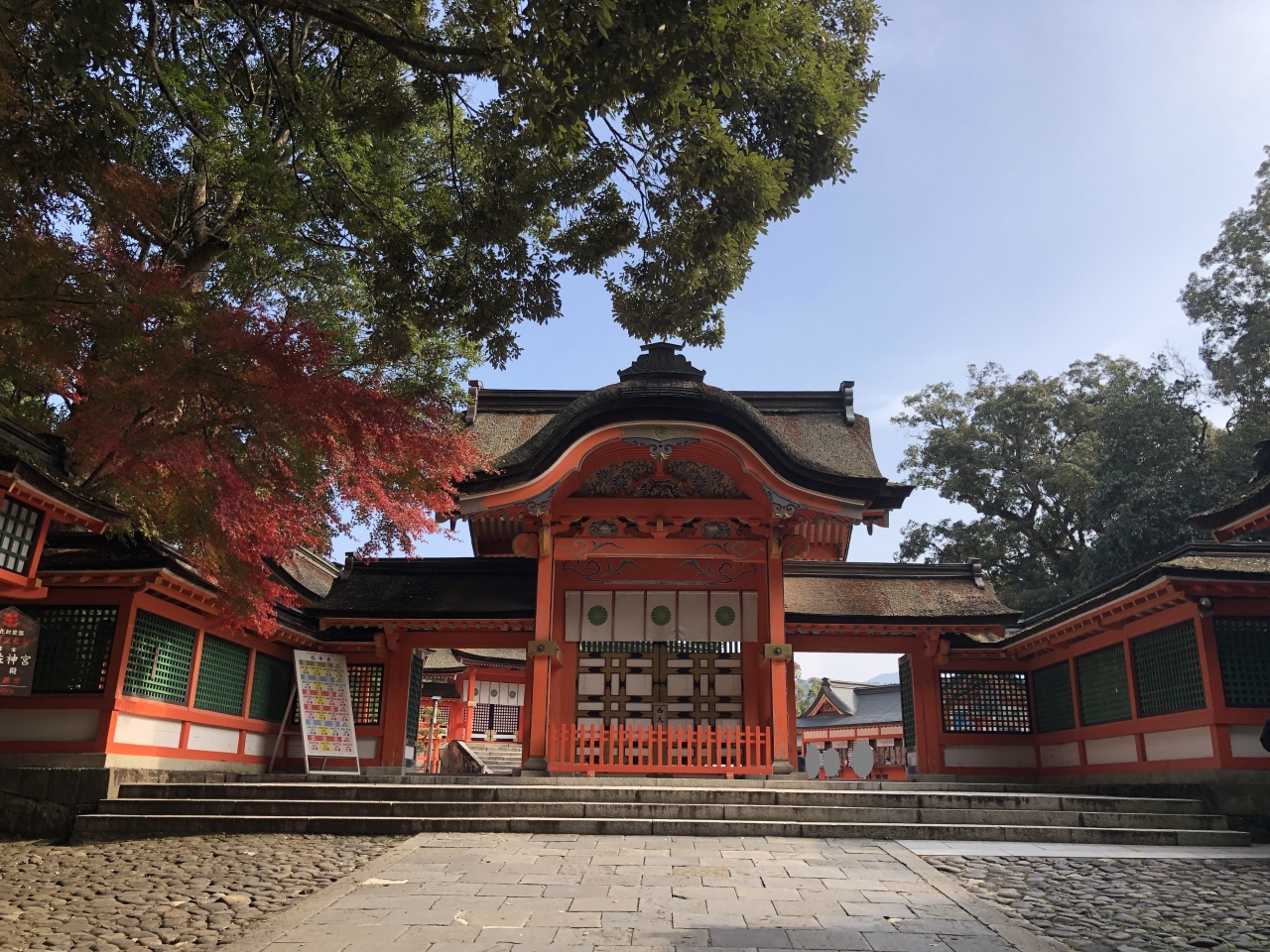 宇佐神宮の上宮に参拝する際に通りました。16世紀の終わりぐらいに改築されたと言われているそうで、歴史を感じさせるたたずまいでした。11月中旬に行きましたが、紅葉の季節で、まわりの色づいた葉がとけこむような色合いでとてもきれいでした。