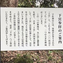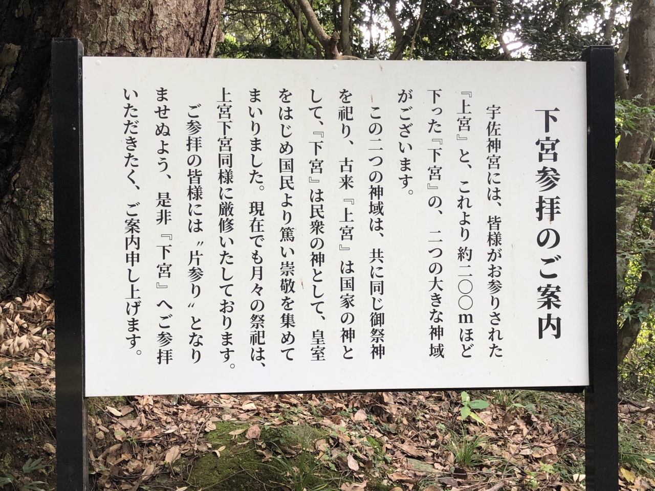 宇佐神宮の上宮の参拝を終えて階段を少し下ったところに、下宮への参拝通路の案内板が出ていました。「下宮参らにゃ片参り」とも言われるということもあり、下宮も参拝しました。伊勢神宮では外宮を参拝してから内宮を参拝したことを思い出しながら、宇佐では順番などはどうなっているのか気になりました。
