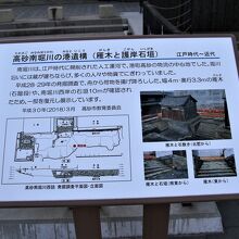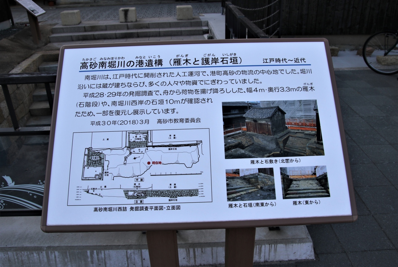 江戸時代北前船の寄港地として栄えた高砂南堀川の港の遺構が一部ですが復元されています。高砂で海運業や港湾改修などをおこなった豪商工楽松右衛門の旧宅が目の前にあるので併せて見学すると良いでしょう。駐車場完備、無料トイレも設置されています。