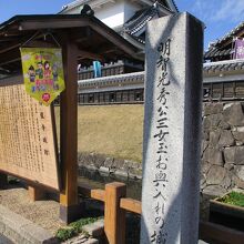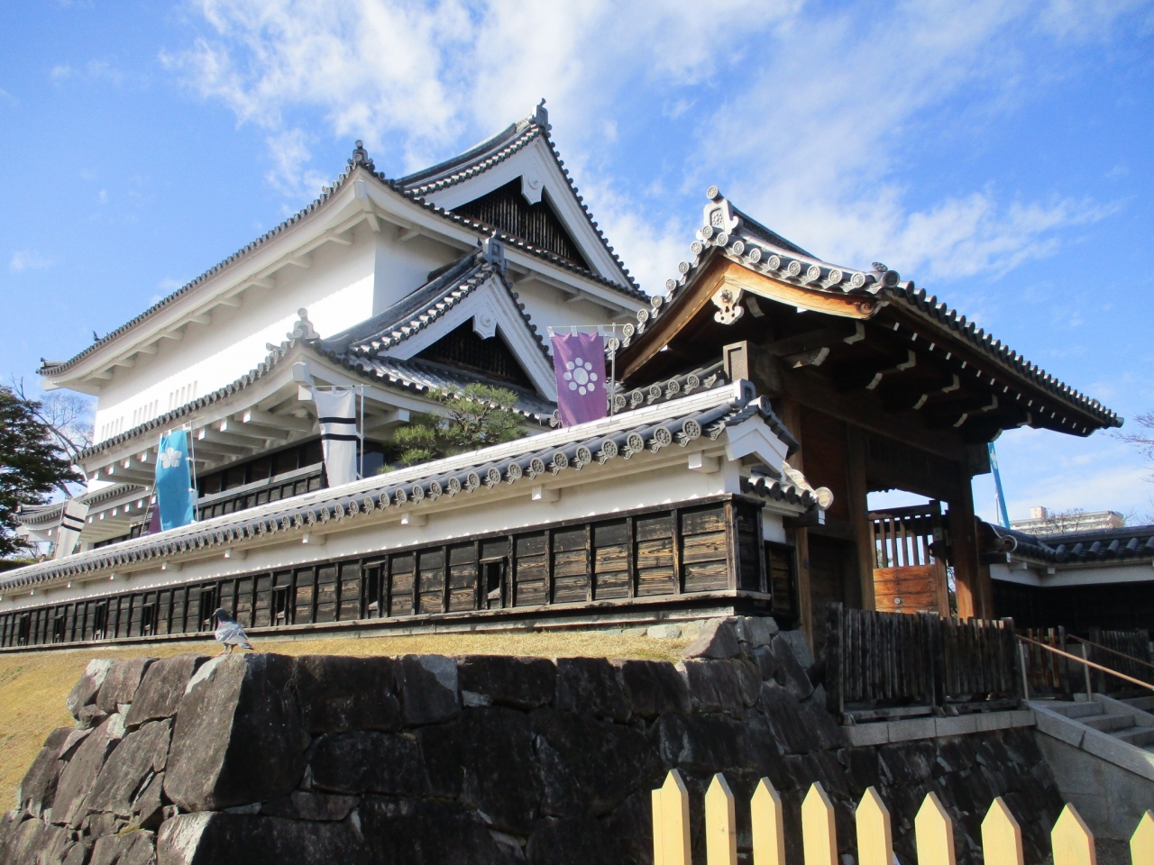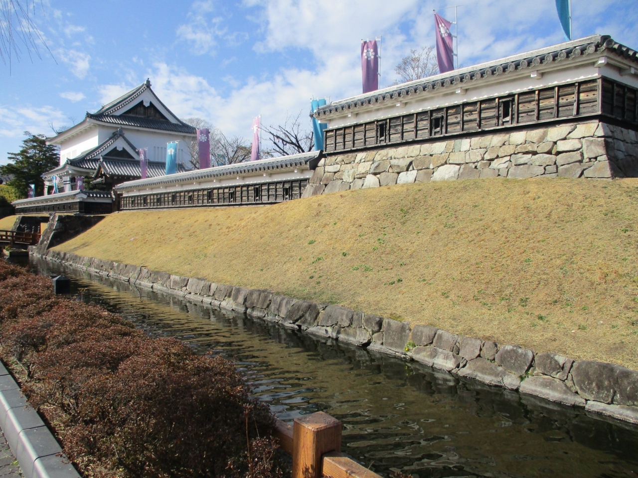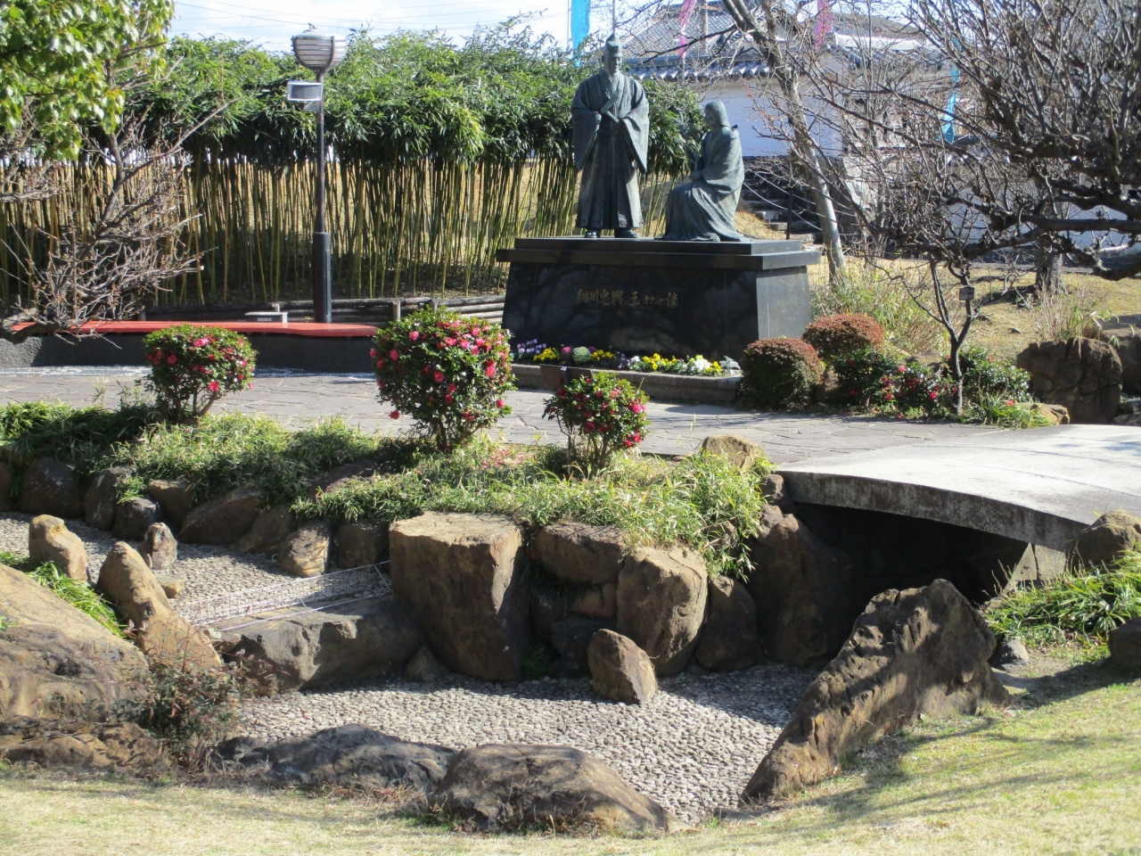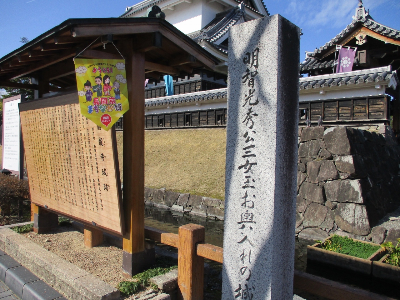 JR長岡京駅から徒歩10分ほどのところにあります。天正6年(1578)に明智光秀の娘・玉(細川ガラシャ)が城主・細川忠興のもとに輿入れし、幸せな結婚生活を送ったといわれています。後年の山崎合戦では、光秀がここに陣を構えました。平成4年に勝竜寺城跡が都市公園として整備されました。堀には鯉が泳ぎ、公園内には細川忠興とガラシャの像、「ガラシャおもかげの水」、光秀出陣テラスなどがあります。お城の2階は歴史ミュージアムです。訪れた時は、人数制限があり、しばらく待ちました。入場無料です。