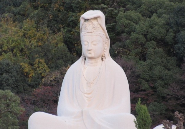 京都の維新の道の近くに突如現れる像です。白くて大きさもとても大きく目立ちますので、少し驚きます。優しい表情の像で、第二次世界大戦の死者の冥福を祈って建てられたそうです。高さは24mだそうで、体内には十二支の像も安置されて、像の近くにはお地蔵様やお堂などもあります。