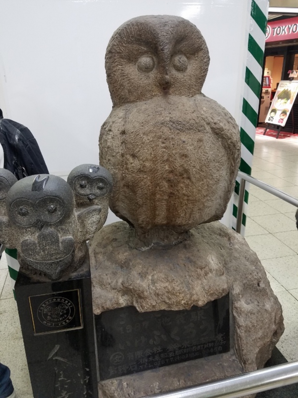 池袋駅の構内、東口(北)の地上に出る階段の前にあります。どことなく田舎の素朴さを感じますが1987年製とありました。隣の小さいやつはやや新しそうですが後年に作られた子ふくろうだそうです。利用者の多い池袋駅の待ち合わせスポットが素朴さ溢れるものだったので心がほっこりしました。