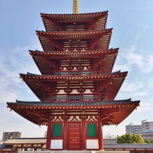 四天王寺のシンボル的な存在で、回廊に囲まれた中心伽藍の南側に建っています。593年に創建されて以来、7度も焼失しています。現在の建物は8度目に再建され、高さ39.2m、鉄骨鉄筋コンクリート製で屋根は本瓦葺となっています。高さがあるので周囲からでも容易に眺めることができます。普段は中に入り塔に上ることもできるようですが、新型コロナの影響か扉は閉ざされていて中の様子を伺うことができませんでした。