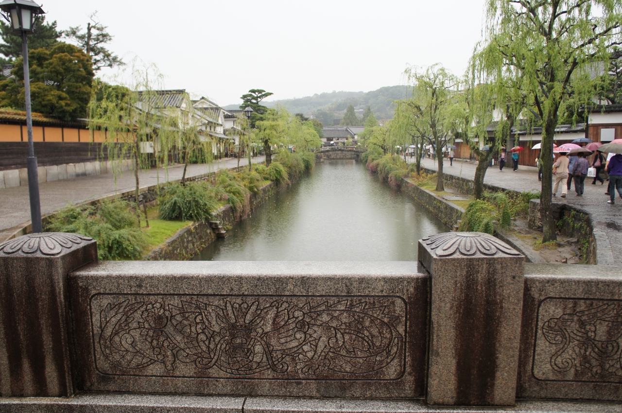 倉敷美観地区を流れている倉敷川にかかっている橋のひとつです。こちらは橋は石橋になっていて、橋の両側には龍の彫刻がされているのが印象的な橋でした。この橋からの美観地区の眺めもよく記念撮影にもぴったりでした。