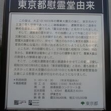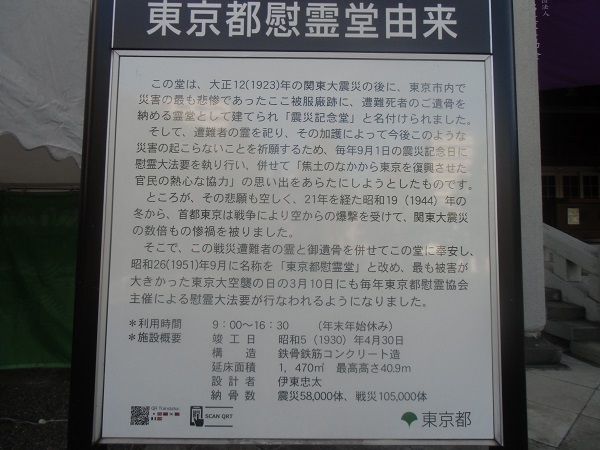 説明板によると、大正12年(1923)の関東大震災の後に、遭難死者の遺骨を納める霊堂として建てられ「震災記念堂」と名付けられました。
