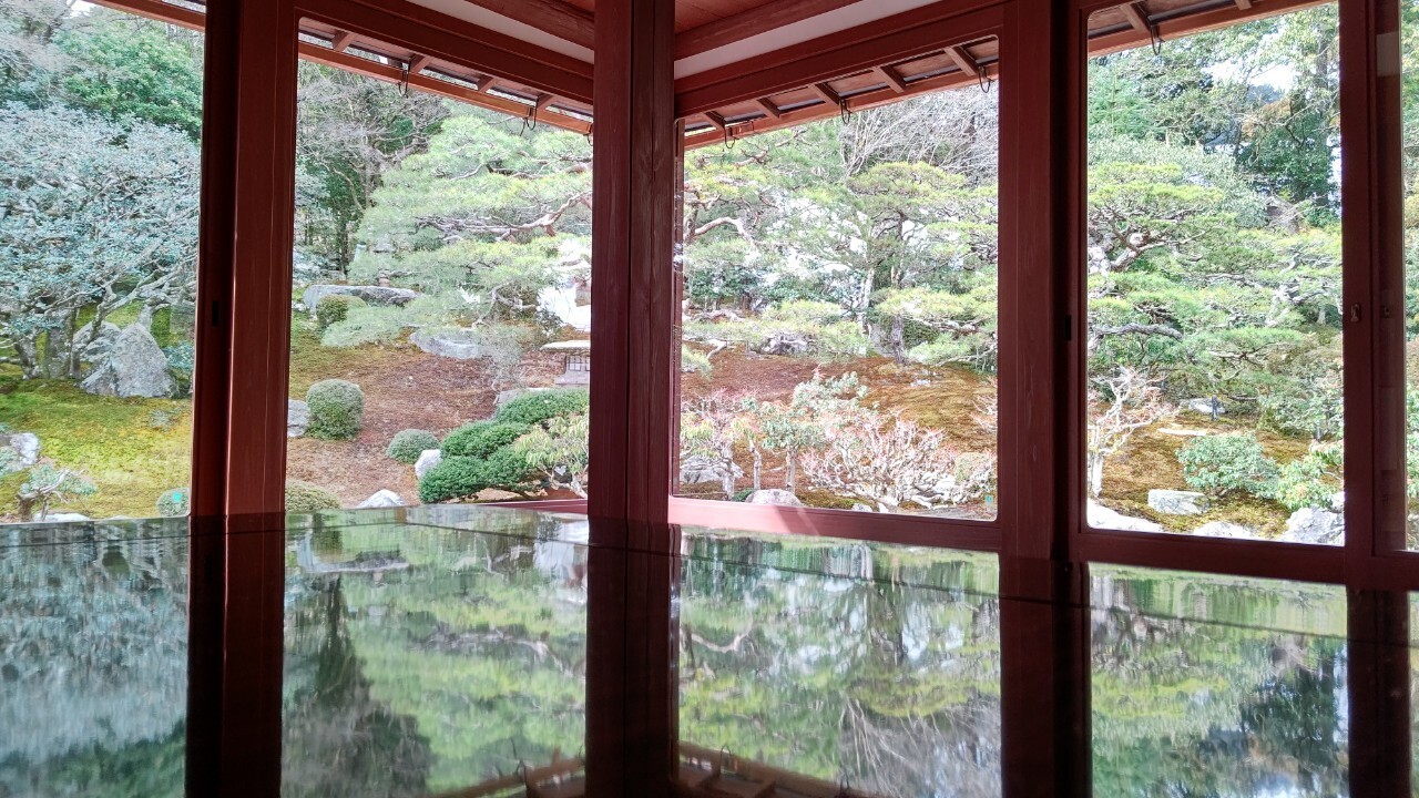平日午前中、コロナの影響もあり他に誰も人が居ませんでした。家のようなところに入ると一階と二階に広い座敷があります。ツルツルの机が置いてあり、その机に庭の風景が映り込み写真に収めると素敵な画像になります。目で見るよりもカメラを通して見たほうが美しいです。