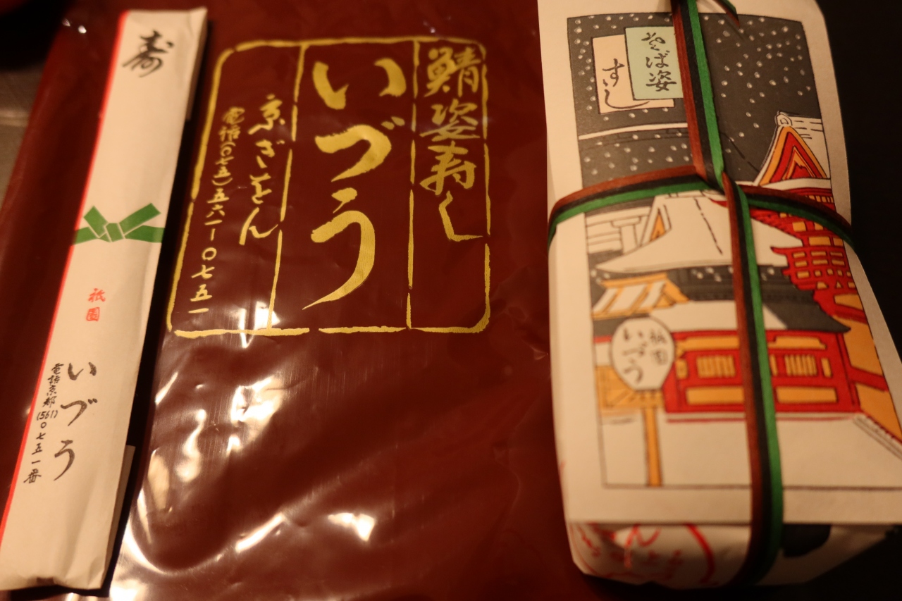 京都の鯖寿司は有名ですが、その中でも老舗中の老舗がいづうです。お店は四条通りから巽橋に向かう途中にあります。お店で頂きたいところですが、時間もなく、戻る日に予約ハーフの鯖寿司をテイクアウトで購入しました。お店の開店は11時からですが、予約すると鯖寿司ならば開店前の時間でも買うことができます。お店の方の対応も良く、気持ち良く購入できました。鯖寿司の値は張りますが、それ相応の味でとても美味しくいただけました。