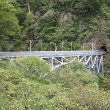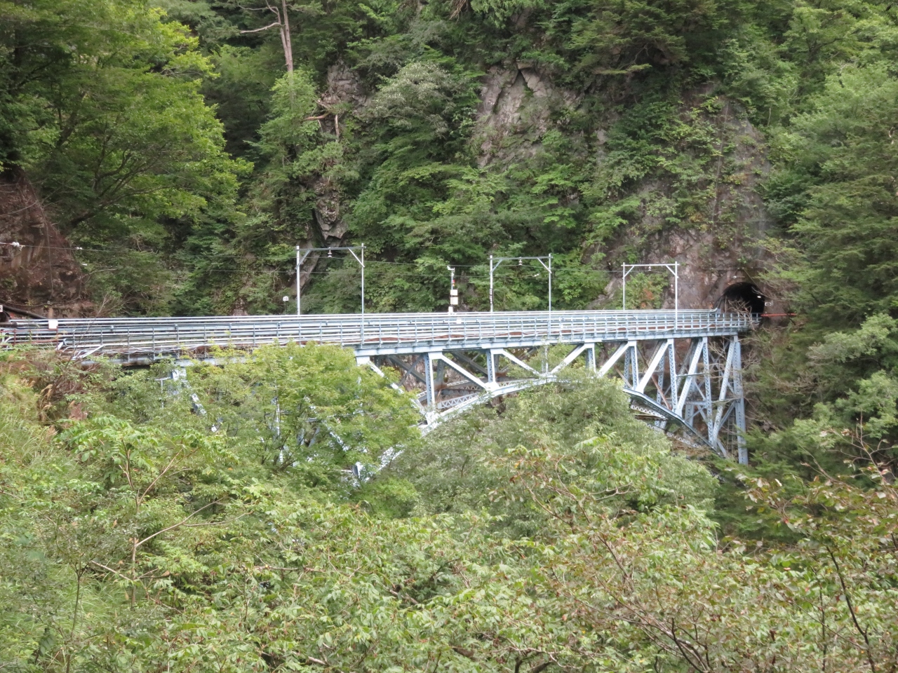 黒薙駅からすぐのところに掛かる橋で高さが60mもあります。トロッコに乗っていると下を覗くことができないのであまり高さを感じませんでしたが、黒薙温泉に向かうときに橋の方を見てみるとかなり高いところにあることがわかります。赤い橋が多い黒部渓谷ですがここは青い橋でした。