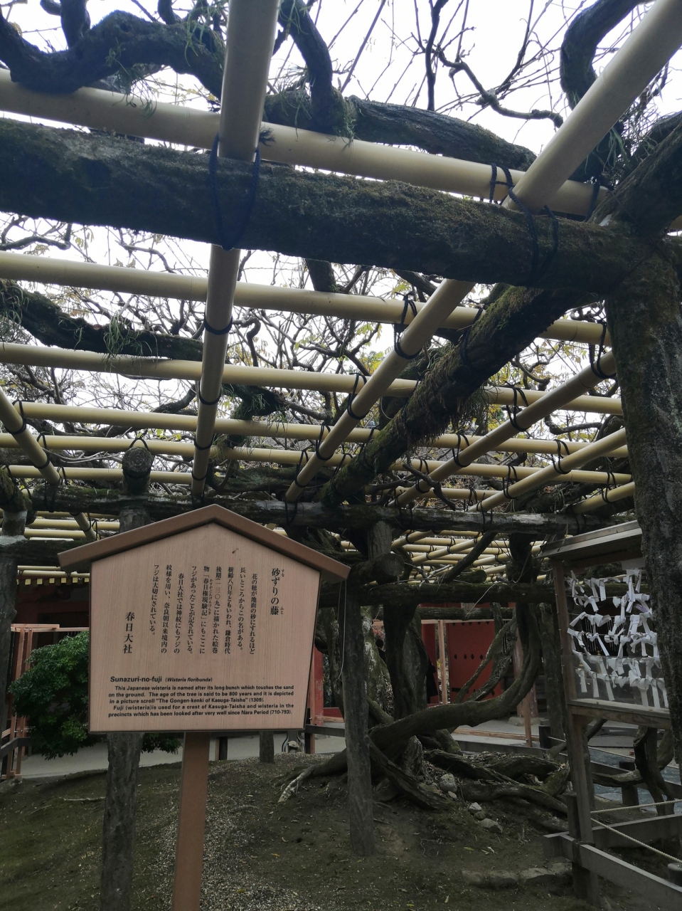 春日大社の慶賀門のすぐ前にあります。花穂が地面の砂にすれるほど長いところからこの名があるそうです。春日大社の社紋は下り藤だそうで神社の象徴の一つですね。花ですのでどうしても季節を選ぶ面があるのは仕方ないですね。