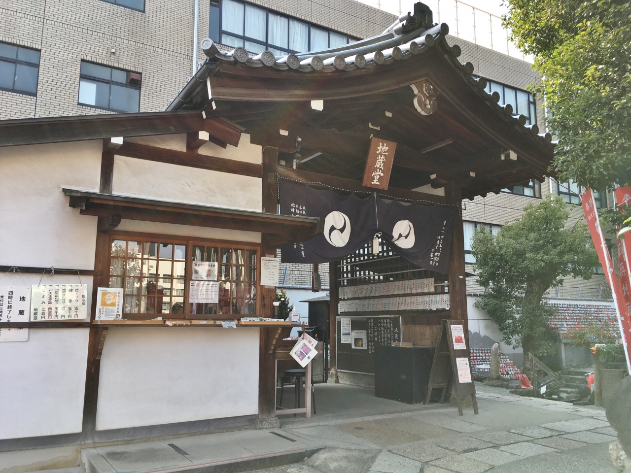 四天王寺の中之門から境内に入り進むと、右手に赤い昇り旗が沢山ある地蔵山があります。明治40年代に四天王寺付近一帯や境内に祀られていた地蔵尊を、中之門南側の小丘に合祀したのが始まりで150体以上もあるとのことです。地蔵山の中央、少し奥まったところに地蔵堂があります。こじんまりとした比較的新しそうなお堂に見えました。ご本尊は眼病にご利益がある立江地蔵尊を祀っていて、毎月24日に法要が行われています。