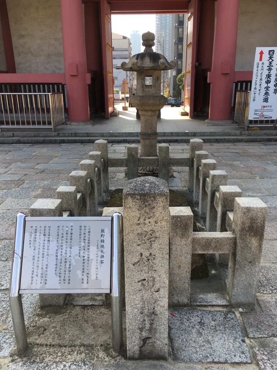 四天王寺の境内には「四石」と呼ばれる4つの霊石、転法輪石、引導石、伊勢神宮遥拝石、熊野権現礼拝石があります。それぞれ4ヶ所に配置されていて、熊野権現遥拝石は南大門を入ってすぐのところにあります。説明板によると、熊野権現を目指した人々がこの礼拝石に立って手を合わせ、道中の安全を祈ったと伝えられています。東大門前ににある伊勢神宮遥拝石と同様に、強い信仰心を感じました。