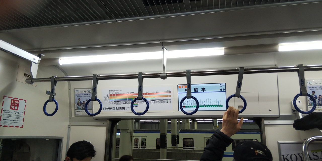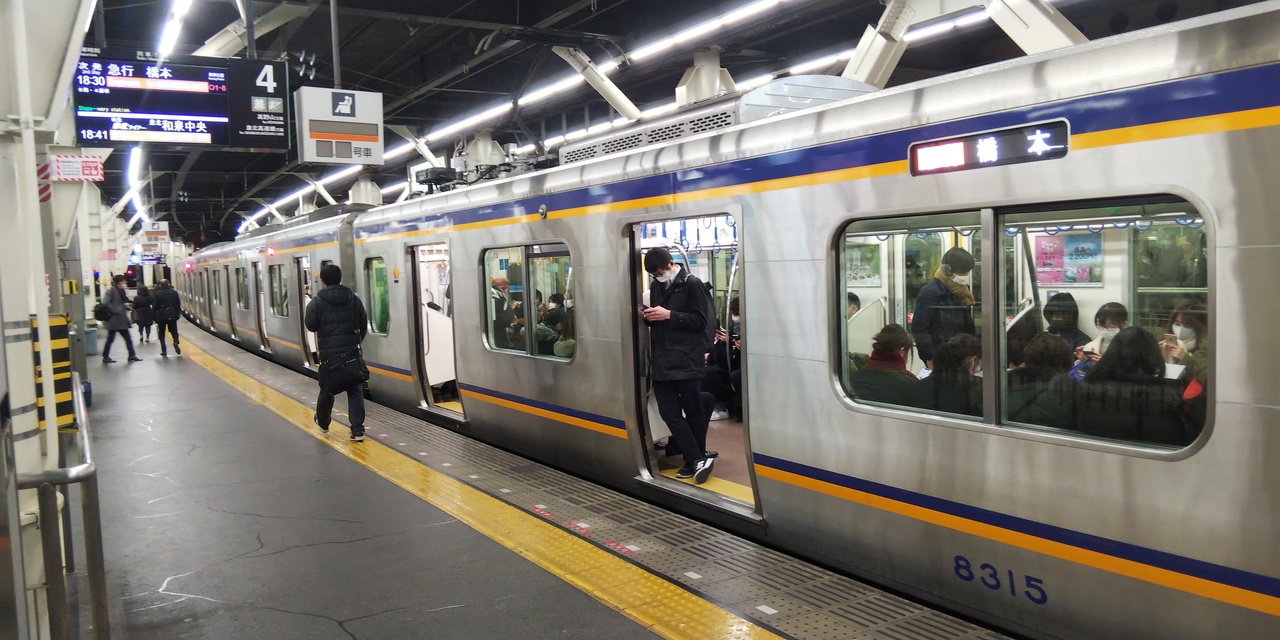 18時30分、難波発の急行橋本行きに乗車しました。平日だったので、仕事帰りのヒトで混雑していました。緊急事態宣言が出ていても朝夕ともに座れないぐらいの乗車率です。最近は列車内の表示も日本語・英語・中国語・ハングルなどが出ています。
