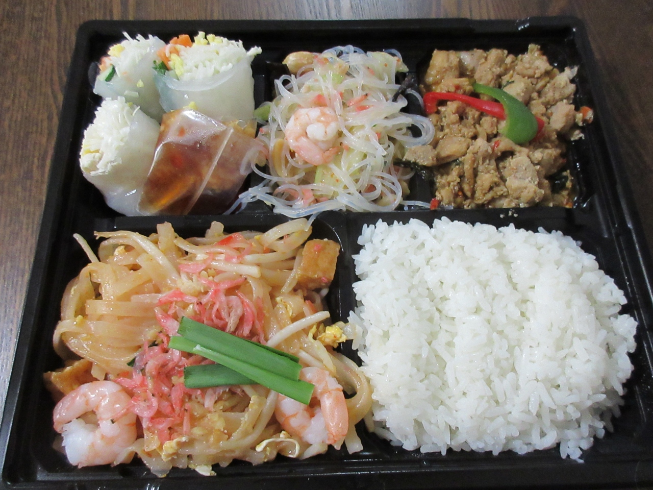 タイ弁当860円を購入、パッタイ(味普通)生春巻き・ガパオ・ごはん(余り辛くない)タイ春雨サラダが入っています。