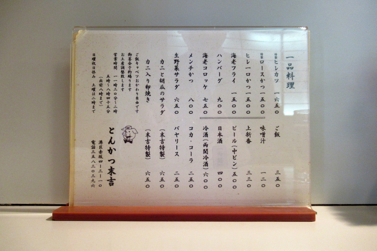 - 赤坂のとんかつ屋さんで、なかなか良い肉を使用したロースかつ定食が1300円、良いと思います