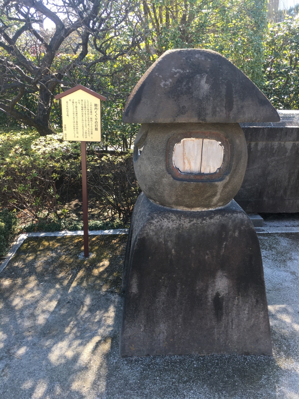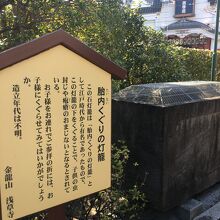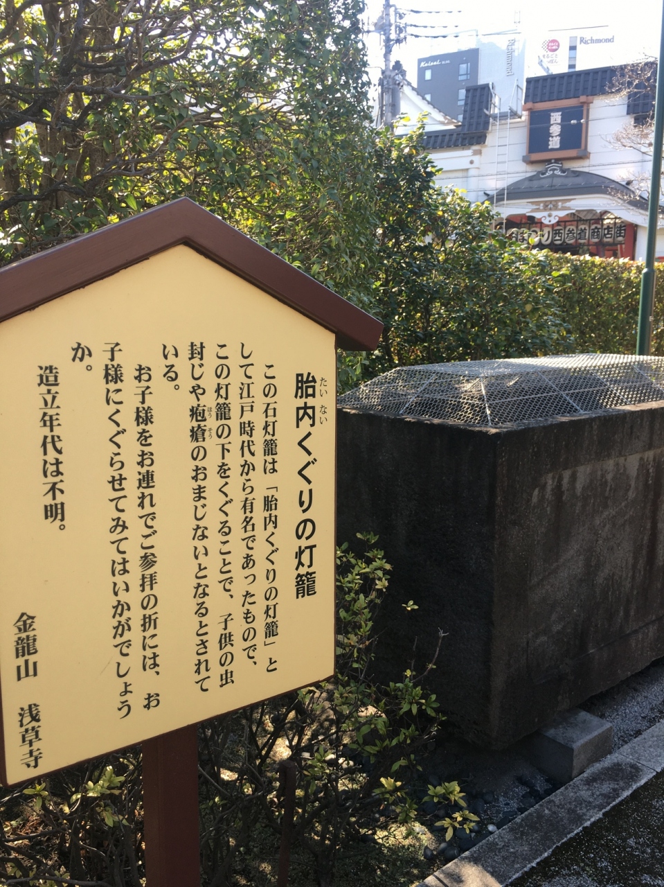 江戸時代から有名だった灯籠で、下は潜れるようになっていて、子供の虫封じや疱瘡のおまじないになるとされ、潜ってもの良いと書いてありました。異なる石が3つ重なり真ん中の石には三日月マークがありました。浅草寺内の淡島堂にあります。