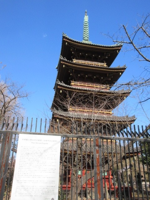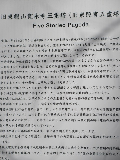 もともと東照宮の一部として建てられた五重塔でしたが焼失していまい、現在のものは再建されたそうですが、重要文化財に指定されている立派なものです。明治時代に取り壊されそうになったところ、寛永寺のものとして存続し、現在は東京都のものだそうです。いろいろな歴史をたどってきたのですね。東照宮参道からよく見える場所があって、説明板もあるのでわかりやすかったです。