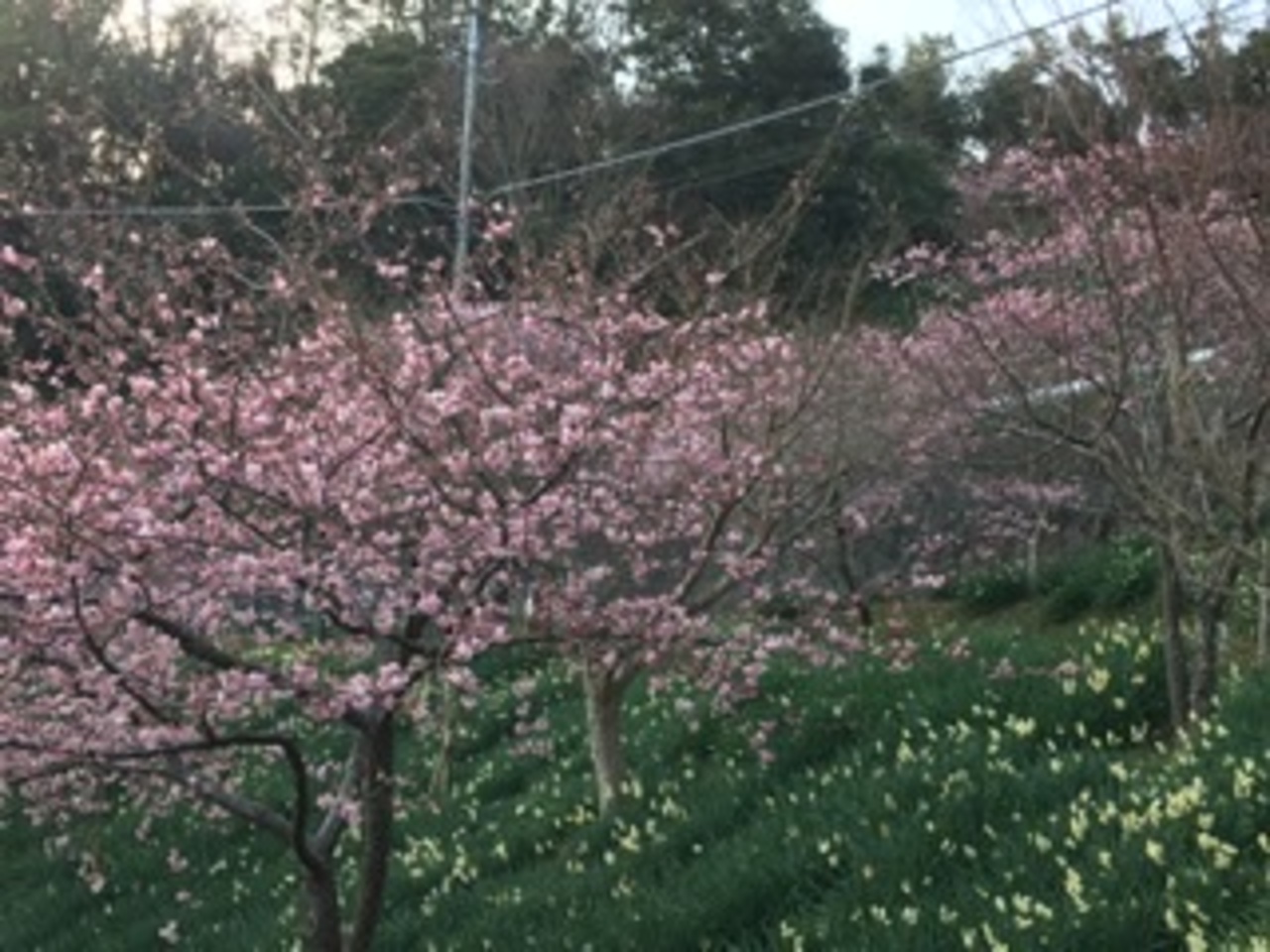 人工湖である佐久間ダム湖畔にある公園で、スイセンと頼朝桜と呼ぶ早咲きの川津桜で有名な公園です。新型コロナウイルス感染症対策でスイセンまつりは中止になったようですが、例年どおりスイセンの花が美しく咲いていたうえ、頼朝桜も場所によっては七分咲きくらいに元気に咲いていました。
